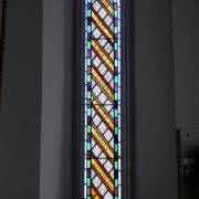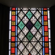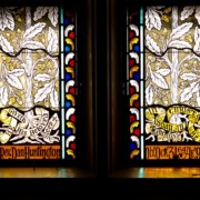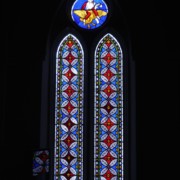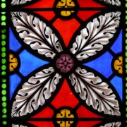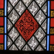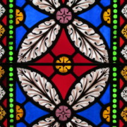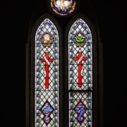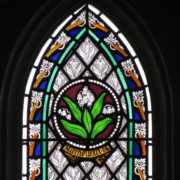 Set into the grisaille are often medallions in bright blue, red, and other colors, decorated not with scenes of Biblical stories as in many churches, but with symbols of religious significance and with words—often quotations from the Bible. This style of window was commonly employed in English parish churches of the thirteenth century. Since Grace Church’s architecture imitates churches like these, the windows appropriately complement the building. Grisaille serves to screen out some of the outdoor light, but not as much as the deeply colored glass popular in earlier Gothic architecture, particularly in France.