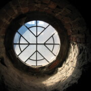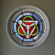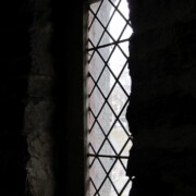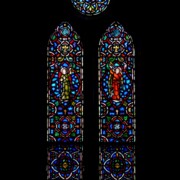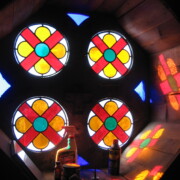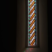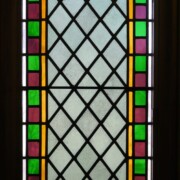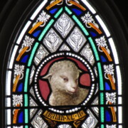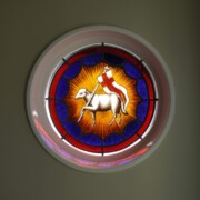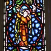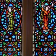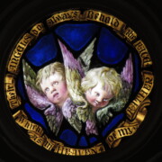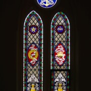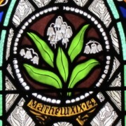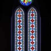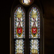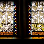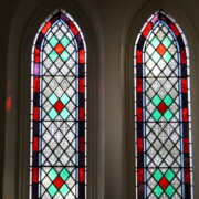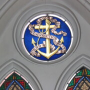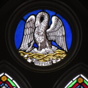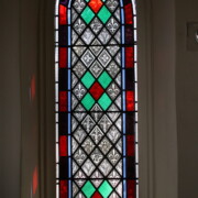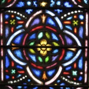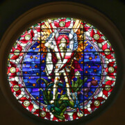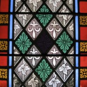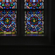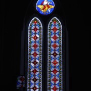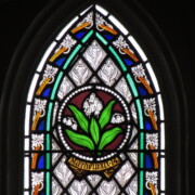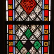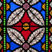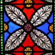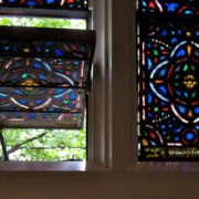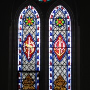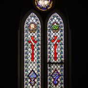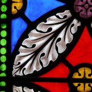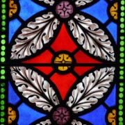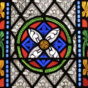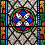 Set into the grisaille are often medallions in bright blue, red, and other colors, decorated not with scenes of Biblical stories as in many churches, but with symbols of religious significance and with words—often quotations from the Bible. This style of window was commonly employed in English parish churches of the thirteenth century. Since Grace Church’s architecture imitates churches like these, the windows appropriately complement the building. Grisaille serves to screen out some of the outdoor light, but not as much as the deeply colored glass popular in earlier Gothic architecture, particularly in France.