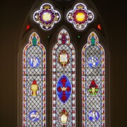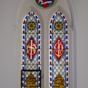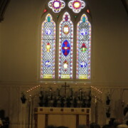The large compound window behind the altar describes fundamental Episcopal beliefs in three parallel tall windows with pointed tops (lancets) below and three smaller, lobed panels above.