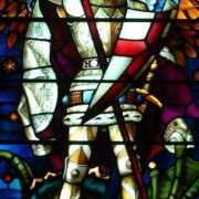 Many of these windows are done in grisaille, a technique whose name comes from the French word for gray, gris. Look closely at the grayish background, and you’ll see that it is composed of small diamond-shaped panes, each hand-painted in the same design using black, gray, or occasionally white enamel on frosted white glass.